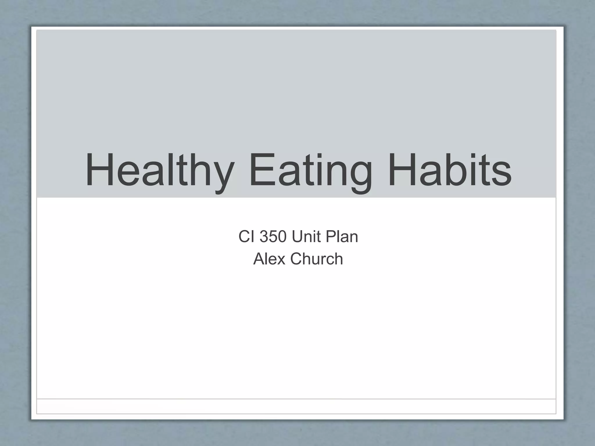 This document outlines a unit plan for a 3rd grade physical education class to teach healthy eating habits over the course of one week. The plan includes daily activities such as a teacher presentation on the food groups, having students keep a food log, analyzing nutrition facts of snacks, creating a "My Plate" diagram, and a game that incorporates physical activity and food learning. Various teaching methods and technologies will be used including videos, journals, diagrams, games, and student presentations. The goal is for students to understand and be able to categorize healthy and unhealthy foods with 100% accuracy by the end of the week.