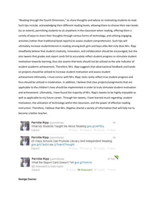 The document summarizes the author's experience following various educators on Twitter over the course of a month. The educators shared advice on teaching strategies, student motivation, and technology integration. Some key ideas included using technology to increase collaboration, making work meaningful for students to motivate them intrinsically, and recognizing all student talents rather than just high achievers. The author learned about flipping the classroom, virtual learning environments, and the importance of technology skills for 21st century students. Overall, the experience provided guidance for the author to become an effective teacher.