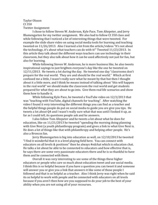 Taylor Olsson followed several educators on Twitter for a class assignment, including Steven W. Anderson, Kyle Pace, Tom Altepeter, and Jerry Blumengarten. Olsson observed the types of content each educator shared, such as inspirational quotes, education resources, and ways to engage students. Olsson found value in connecting with other educators on Twitter to gain insights and answers to questions about teaching.