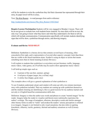 This document provides information about a lesson plan for a 10th grade English class. It will focus on symbolism and imagery. For symbolism, students will come up with short stories including symbols and identify symbols in others' stories. For imagery, students will draw what they hear as classmates describe people, places, etc. and identify imagery in an excerpt from The Kite Runner. The lesson aims to help students understand and identify these literary devices through interactive activities involving stories, drawings, and class discussion. Materials used will include the internet, paper, markers, and the text.