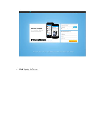 Twitter is a social media platform that allows users to share short messages called tweets. It is considered a web 2.0 application because its value comes from user-generated content rather than software. Creating an account involves providing information, following other accounts, and customizing a profile page. Users can post tweets with text, photos, locations and hashtags to organize topics. Tweets can be liked, shared, or replied to. In education, Twitter allows students to follow educators, share opinions, participate in discussions, collaborate on projects, and build a classroom community.