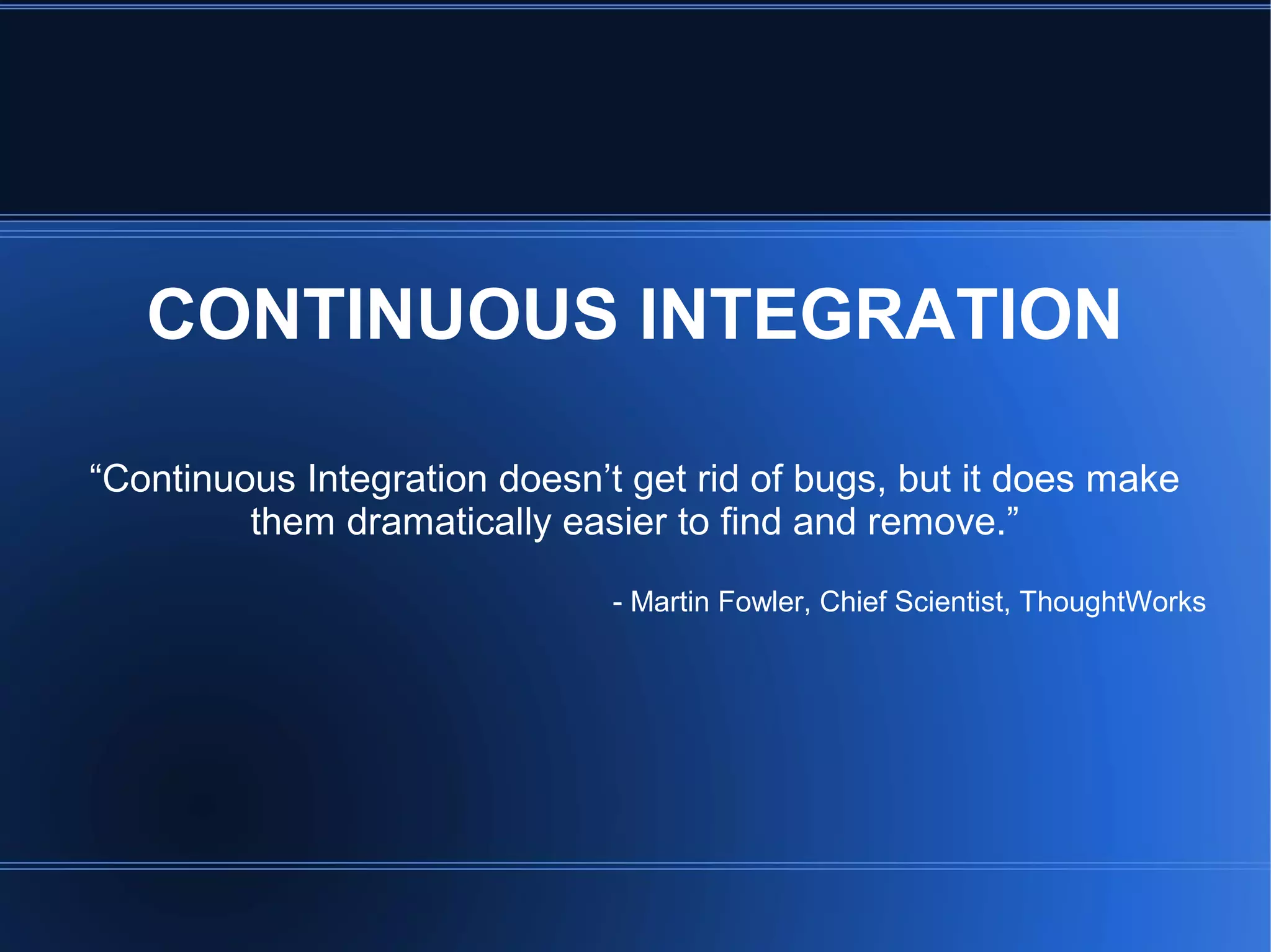 Continuous integration (CI) is a development practice where developers integrate code into a shared repository several times a day, with each check-in verified by an automated build to detect problems early. The key practices of CI are maintaining a single source repository, automating builds, making builds self-testing, building on every commit in an integration machine, keeping builds fast, testing in a production-like environment, making builds easily accessible, providing visibility into the process, and automating deployments. Benefits of CI include reducing time spent on integration issues, increasing communication, catching bugs early, spending less time debugging and more time adding features, and enabling more rapid software delivery.