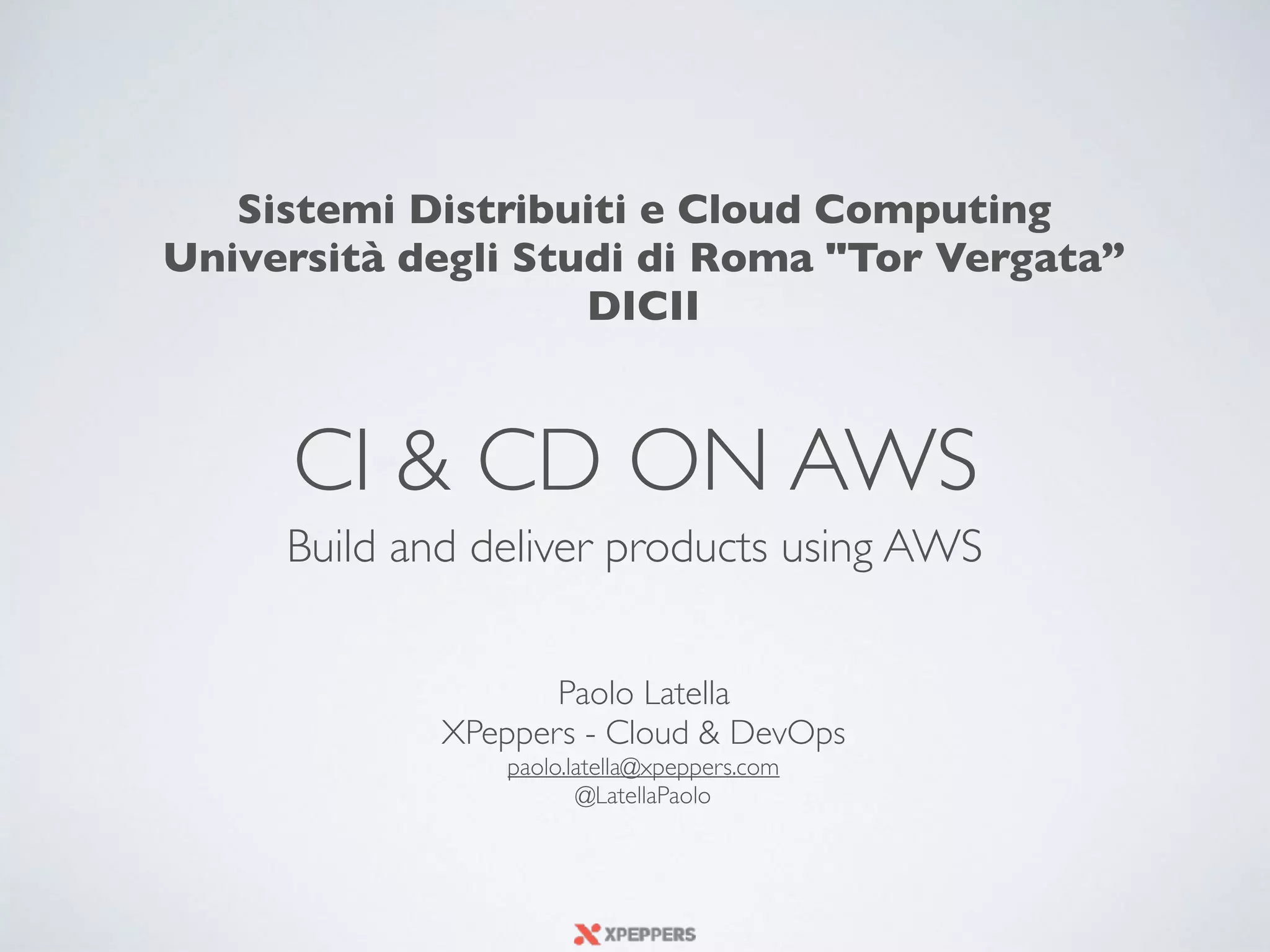 The document discusses Continuous Integration (CI) and Continuous Delivery (CD) on AWS, detailing tools such as AWS CodeCommit, CodePipeline, CodeBuild, and CodeDeploy. It explains the functionalities of each tool, such as repository management, pipeline creation, build automation, and application deployments, while emphasizing their integration with various AWS services. Additionally, it covers infrastructure as code through AWS CloudFormation for automating and managing cloud resources effectively.