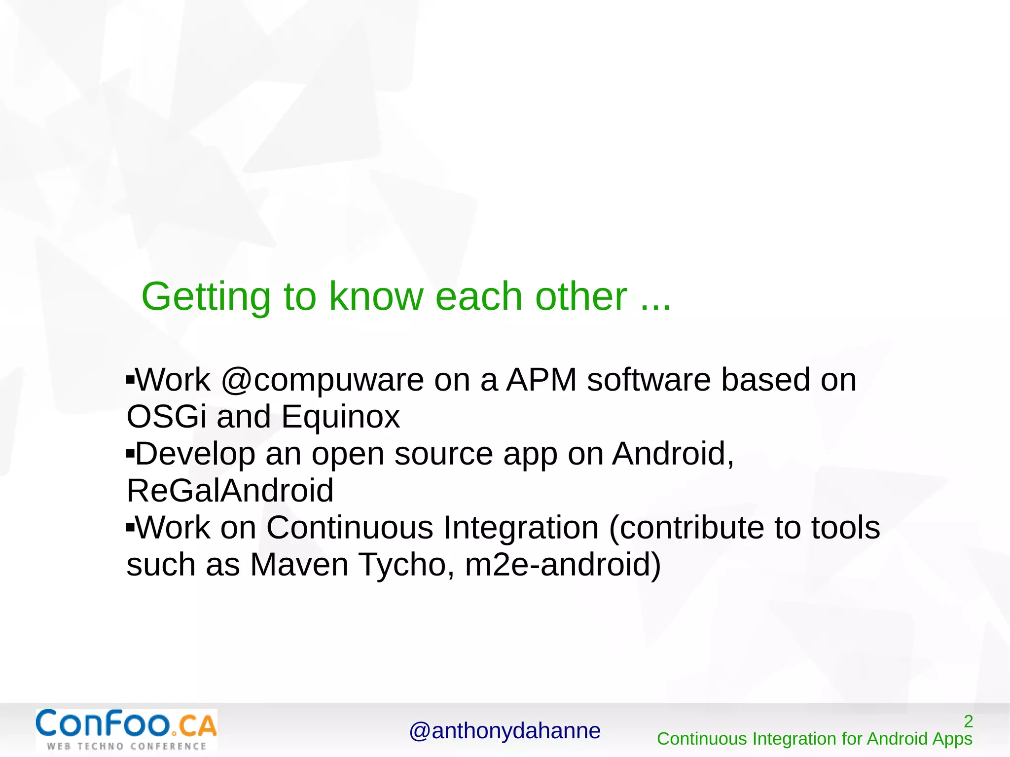The document provides an overview of continuous integration (CI) for Android apps, explaining its importance, benefits, and how to implement it using tools like Ant and Maven. It covers steps for building and testing an Android app, including recommendations for setting up a CI environment and integrating testing practices. Additionally, it discusses advancing beyond CI to include continuous quality control and deployment practices.
