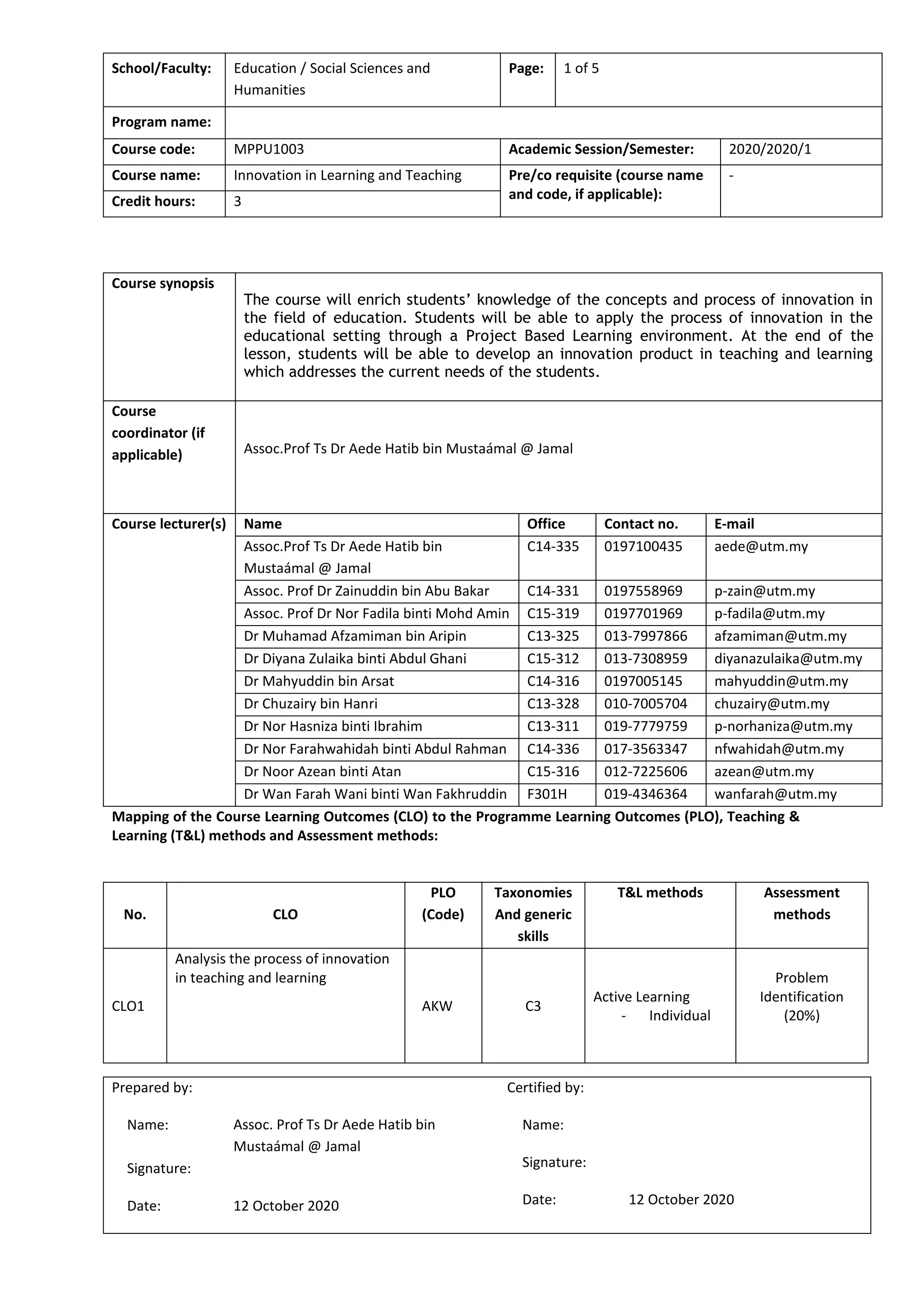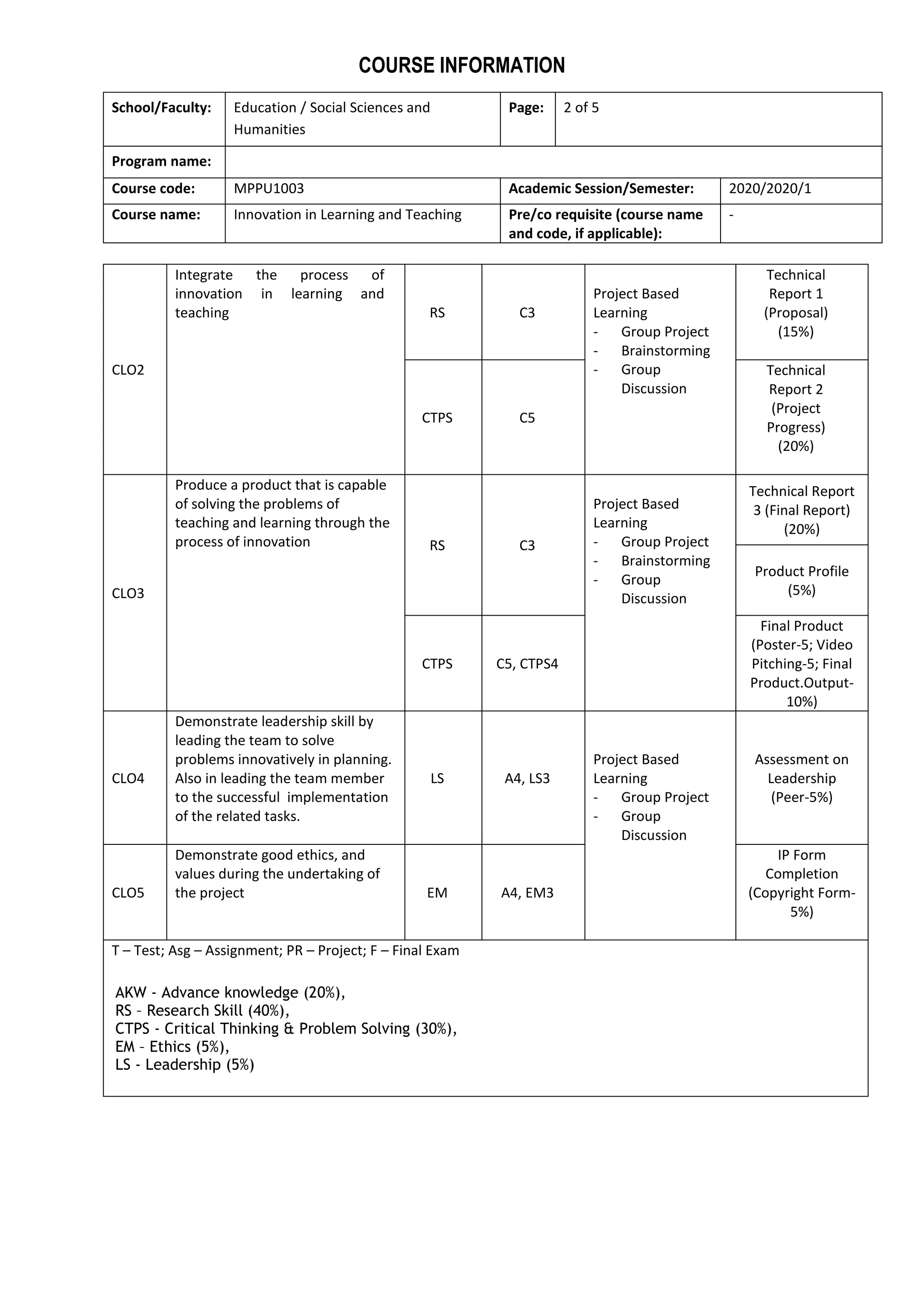 This document provides information about a course titled "Innovation in Learning and Teaching" including: