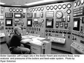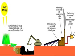 1) The heat energy in steam is converted to kinetic energy as it enters the turbine through nozzles, and then to mechanical work as it impacts the rotating blades.
