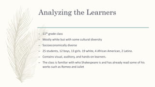This unit plan aims to analyze Shakespeare's play The Tempest with an 11th grade English class over 5 days. The class contains a diverse group of 25 students with different learning styles. They are already familiar with Shakespeare's works. Each day focuses on a different part of the play - reading, discussion, videos - with the goal of understanding key points. Students will work in groups to rewrite the ending and present final projects applying technology like PowerPoints and videos. Resources include online summaries and guides, as well as recordings of Shakespeare's works.