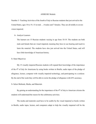 This document outlines a teaching module for 15 Russian students ages 10-19 who are visually impaired. The module aims to teach the students about the importance of the 4th of July in America. Over the course of a week, the students will learn about American history and recite the Pledge of Allegiance using adapted materials like Braille books, audio tapes, and screen reading technology. Their learning will culminate in a cookout to experience a common July 4th activity. Their understanding and ability to recite the Pledge of Allegiance will be evaluated at the end of the week.