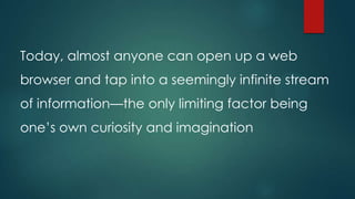 The document discusses critical thinking as an important 21st century skill. It defines critical thinking as using reasoning to form judgments, analyze arguments, and solve problems. Some ways to develop critical thinking include using systems thinking, making evidence-based decisions, and asking meaningful questions. The document recommends applying critical thinking to education by preparing learners to think independently. It provides examples of how to implement technology like WebQuests, blogging, and games to enhance critical thinking skills.