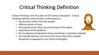 Critical thinking is the first pillar of 21st century education and focuses on exploring problems from different perspectives rather than just finding answers. It is important because it encourages thinking outside the box and combining knowledge to solve problems in new ways. Technology can expand critical thinking by providing information and challenging students to think more independently by accessing knowledge from anywhere. Some examples of how to apply critical thinking in education include mystery skype games between classrooms that require students to investigate clues and find solutions without direct instructions.