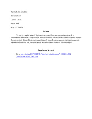 Twitter is a social media platform that allows users to share short messages called tweets. It is considered a web 2.0 application because its value comes from user-generated content rather than software. Creating an account is simple and involves following others so their tweets appear on your timeline. Tweets can include photos, locations, hashtags, and mentions of other users. Educators can use Twitter to engage students by sharing opinions, collaborating on projects, and having classroom discussions in a fun way. However, Twitter can also be distracting for students and intrude on a teacher's personal life if not used appropriately.