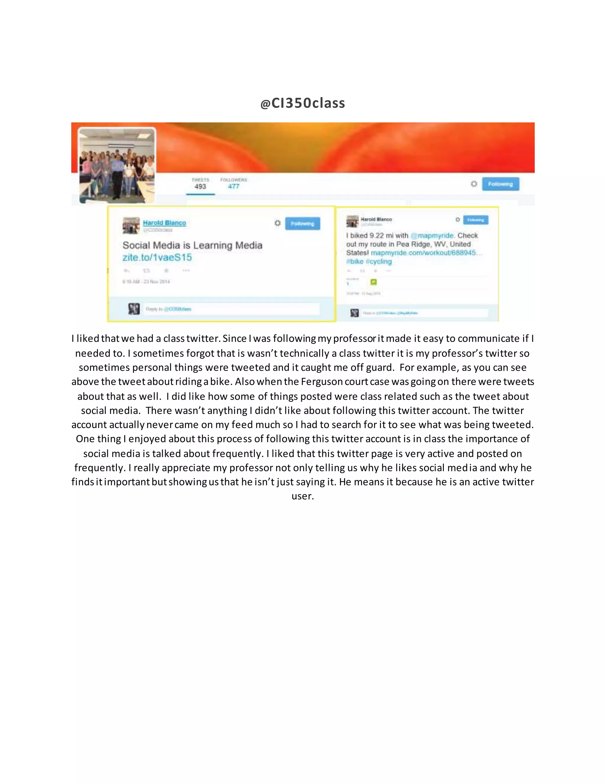 2) They enjoyed the tweets about class topics like social media, and the account showed the professor's genuine interest in social media.