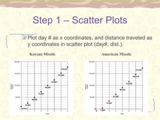 The document summarizes the steps taken to calculate the intersection point of the trajectories of missiles launched by North Korea and the United States. It finds that the missiles will intersect 10.5 days after launch at a distance of 234,600 miles from Earth. Since the moon is 238,897 miles from Earth, the American missile will stop the Korean missile about 4,297 miles before it hits the moon.