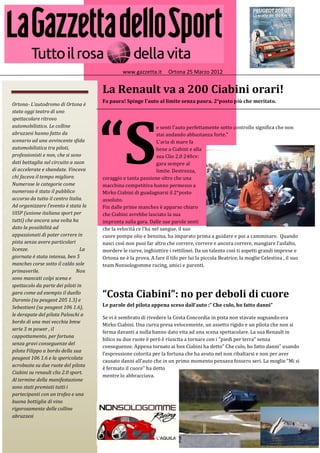 Il 25 marzo 2012, l'autodromo di Ortona ha ospitato una competizione automobilistica emozionante, con Mirko Ciabini che ha conquistato il 2° posto con la sua Renault Clio 2.0. L'evento, organizzato dalla UISP, ha attirato un numeroso pubblico e ha visto piloti professionisti e amatoriali sfidarsi in una serie di manche spettacolari, tra colpi di scena e adrenalina. Nonostante alcuni incidenti, tutti i partecipanti sono stati premiati al termine della manifestazione.