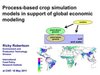 Processed based crop models try to mimic how plants respond to their environment. This presentation discusses using the DSSAT family of crop models to project yields under different climate scenarios for use in global economic modeling. The models require inputs for weather, soil properties, variety attributes and more. They output daily growth metrics and end of season yields. By running the models repeatedly across locations, global yield projections can be generated to feed into models like IMPACT that assess impacts at a regional level. Data quality, model robustness, and computational efficiency are important considerations.