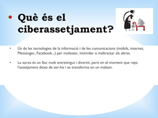Què és elciberassetjament? Ús de les tecnologies de la informació i de les comunicacions (mòbils, internet, Messenger, Facebook...) per molestar, intimidar o maltractar als altres. La xarxa és un lloc molt entretingut i divertit, però en el moment que reps l’assetjament deixa de ser-ho i es transforma en un malson.