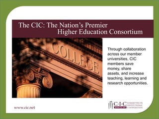 The Committee on Institutional Cooperation (CIC) is a consortium of top-tier American research universities that fosters collaboration to enhance education and research opportunities. In the 2008-09 period, CIC members engaged over 1,400 students in various programs and conducted $6.4 billion in funded research annually, reflecting a significant impact on doctoral education and resource sharing. The CIC also emphasizes cost savings through collaboration, achieving over $9 million in savings for its member institutions.