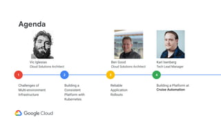 The document discusses the challenges and strategies of implementing CI/CD in multi-environment infrastructure using Kubernetes. It outlines the benefits of building a consistent platform, application rollout strategies, and tools like Helm and Kustomize for managing Kubernetes manifests. Additionally, it emphasizes the importance of automation, traffic management, and security considerations while managing deployments across various environments, including on-premises and multi-cloud scenarios.