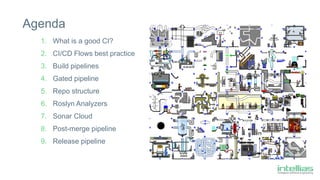 This document provides an agenda and best practices for CI/CD pipelines for .NET workloads using Azure DevOps. It recommends that CI pipelines should block pull requests, run tests faster than 5 minutes, and collect metrics. It suggests repository structure, including separating code, tests, and infrastructure, and using filters to trigger specific pipelines on changes. The document also discusses gated pre-merge pipelines, build pipelines, Roslyn analyzers, SonarCloud for quality analysis, post-merge build pipelines, and release pipelines for continuous deployment.
