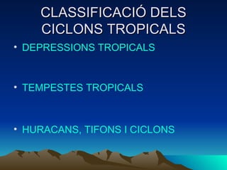 CLASSIFICACIÓ DELS CICLONSTROPICALS DEPRESSIONS TROPICALS TEMPESTES TROPICALS HURACANS, TIFONS I CICLONS