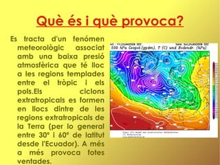 Què és iquè provoca? Es tracta d'un fenómen meteorològic associat amb una baixa presió atmosfèrica que té lloc a les regions templades entre el tròpic i els pols . Els ciclons extratropicals es formen en llocs dintre de les regions extratropicals de la Terra (per lo general entre 30º i 60º de latitut desde l'Ecuador). A més a més provoca fotes ventades.