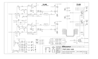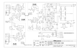 The document details an electronic circuit design for a power amplifier, specifically for channels A and B, indicating specifications for components like resistors and capacitors. It includes diagrams, voltage ratings, and configurations of power supply and protection circuits. The document serves as a technical reference for building or servicing the associated audio equipment.