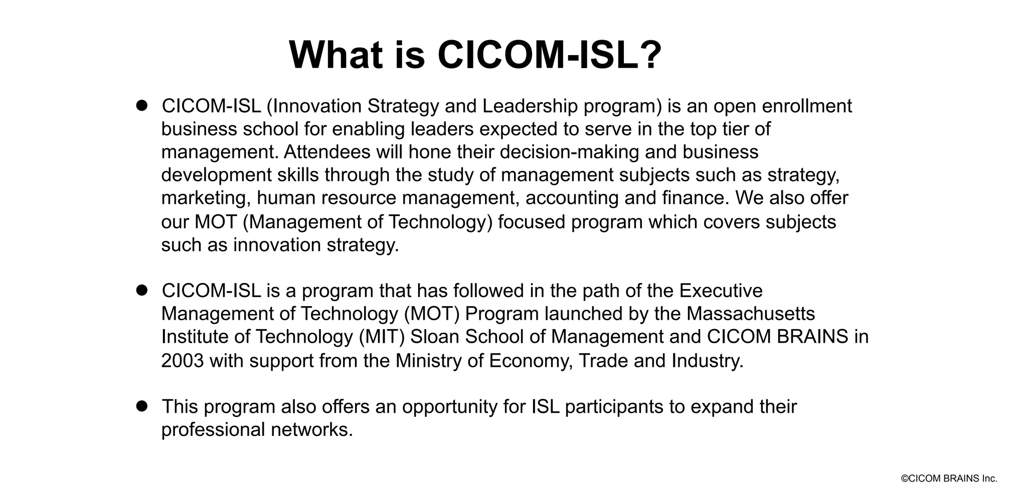 The document provides information about CICOM-ISL, an open enrollment business school program offered by CICOM BRAINS Inc. The program aims to hone the decision-making and business development skills of leaders through studying subjects like strategy, marketing, and human resources. It offers both general management courses and a specialized MOT (Management of Technology) track. The program is held over 6 sessions every other week and targets managers from a variety of industries seeking to advance their careers or bring innovation to their organizations. Instructors include business consultants and academics with experience in fields like consulting, corporate planning, and university teaching.