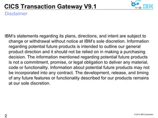 The document provides an overview of IBM's CICS Transaction Gateway version 9.1, highlighting its new features related to mobile integration, security, and connectivity. It details the capabilities of the product suite, including support for JSON web services, a range of programming languages, and tools for transforming data between different formats. Furthermore, it outlines operational enhancements such as configuration options, service definition, and error handling for improved user experience.