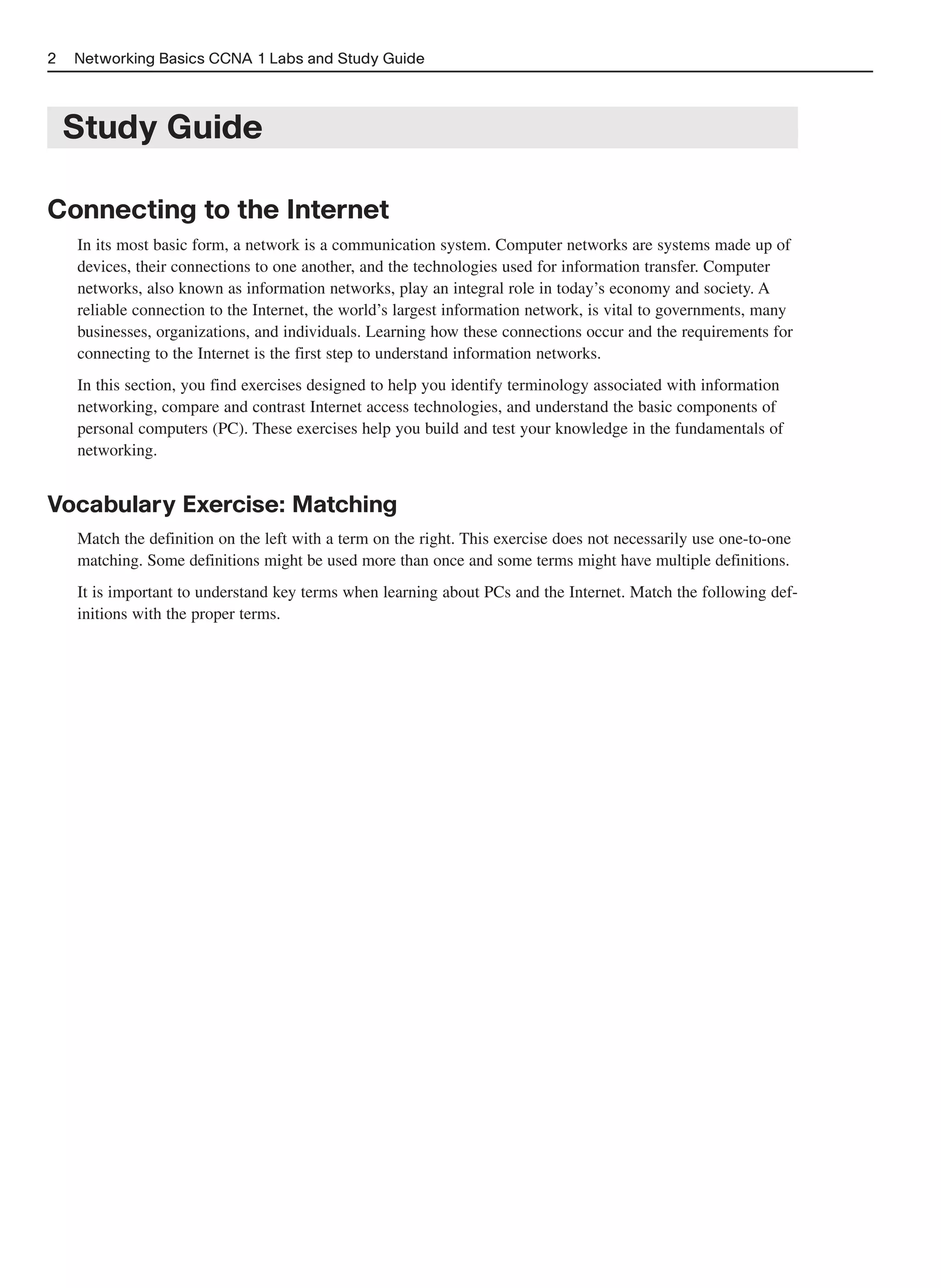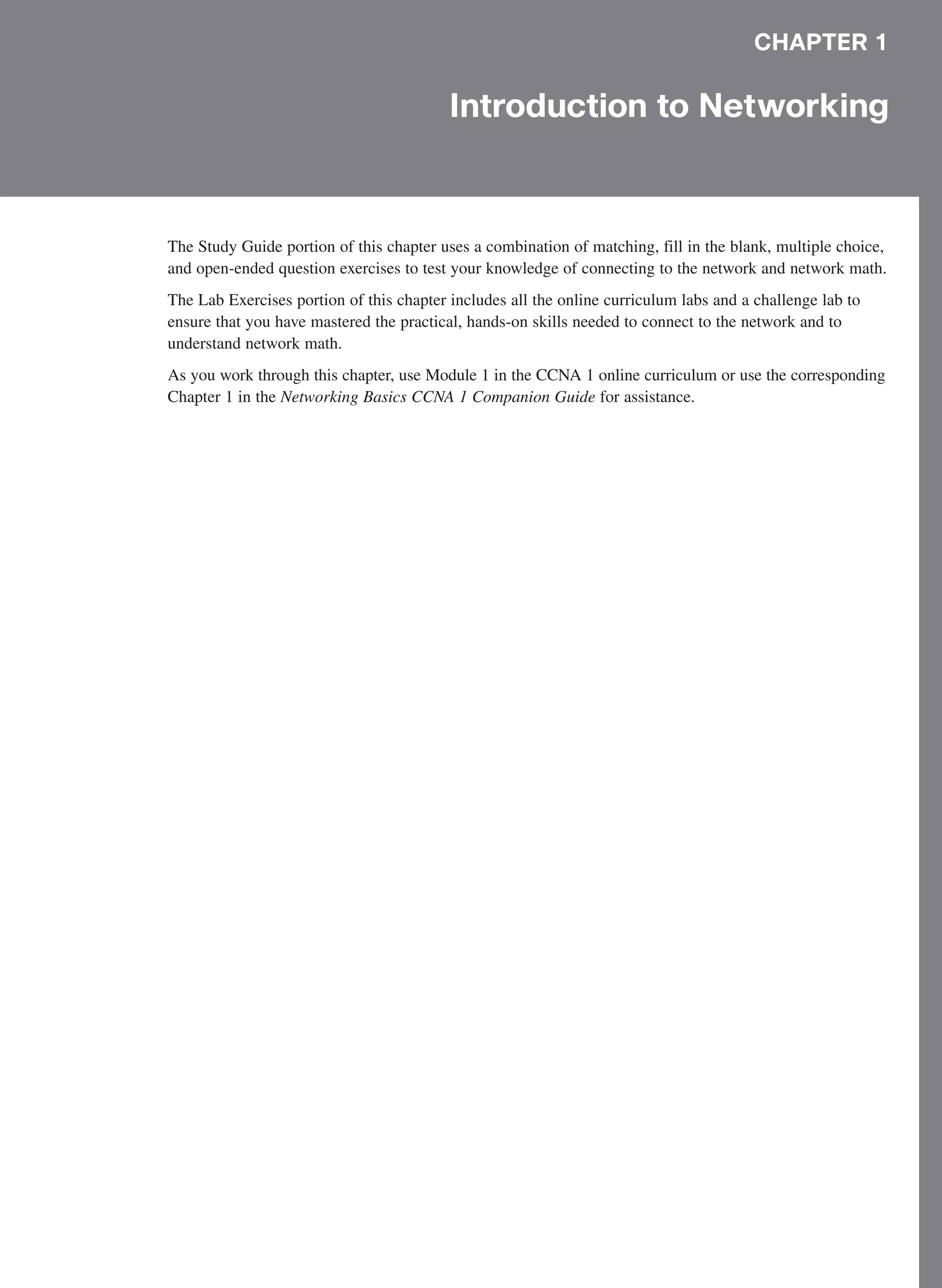 This document introduces Chapter 1 of the Networking Basics CCNA 1 Labs and Study Guide. It discusses connecting to the network and network math. The Study Guide portion contains exercises to test knowledge, including matching, fill-in-the-blank, and multiple choice questions. The Lab Exercises portion includes online curriculum labs and a challenge lab to ensure mastery of practical skills for connecting to the network and understanding network math.
