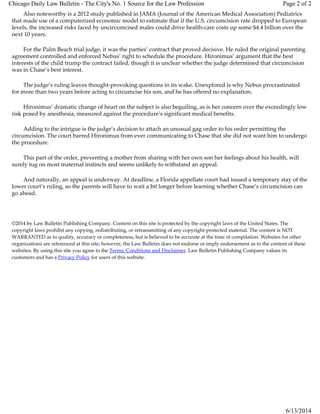The article discusses a legal dispute between unmarried parents Dennis Nebus and Heather Hironimus over whether to circumcise their 3.5-year-old son Chase. Originally both parents agreed to the circumcision but Hironimus later changed her mind. The trial judge ruled that the original parenting agreement requiring circumcision was binding. However, Hironimus has appealed, arguing that the child's best interests should take precedence over the contract. The judge also issued a gag order barring Hironimus from telling Chase that she did not want him to undergo the procedure.