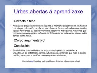 procuren que os espazos urbanos contribúan á memoria social, da cal todos
