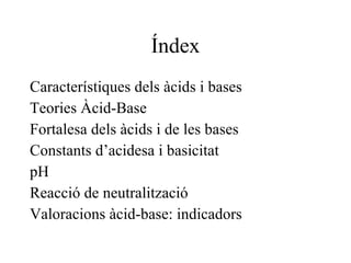 Característiques d’àcids ibases Les solucions àcides Les solucions bàsiques Tenen un sabor àcid (agre) Tenen un sabor amarg Són electròlits Són electròlits Són corrosives Són corrosives Les solucions àcides Les solucions bàsiques