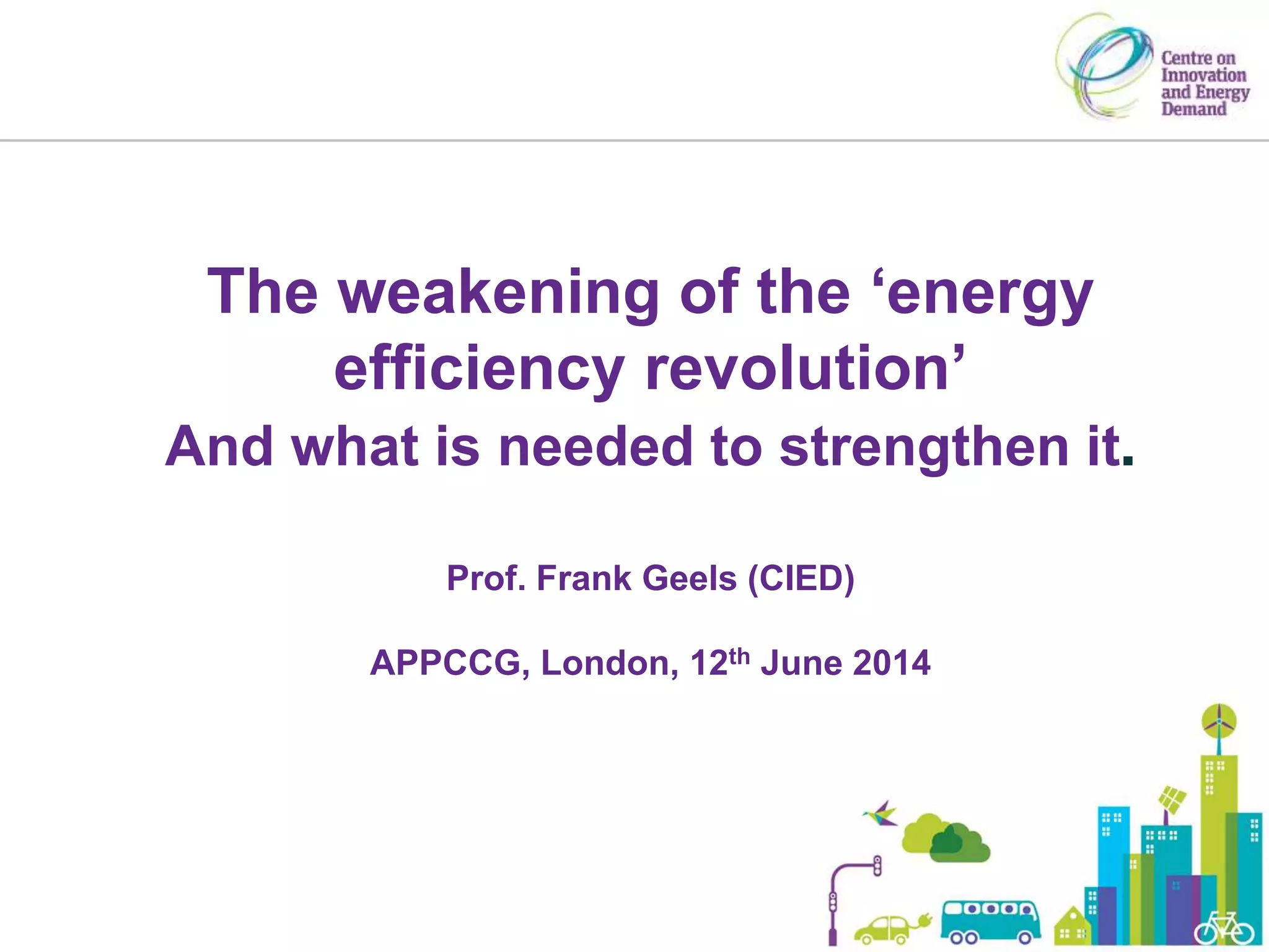 3) A broader conceptual approach is needed that moves beyond mainstream economics focusing just on firms and households to consider the social contexts and behaviors driving energy demand. Understanding the interactions between technology, social factors, and policy could help accelerate the energy efficiency revolution.