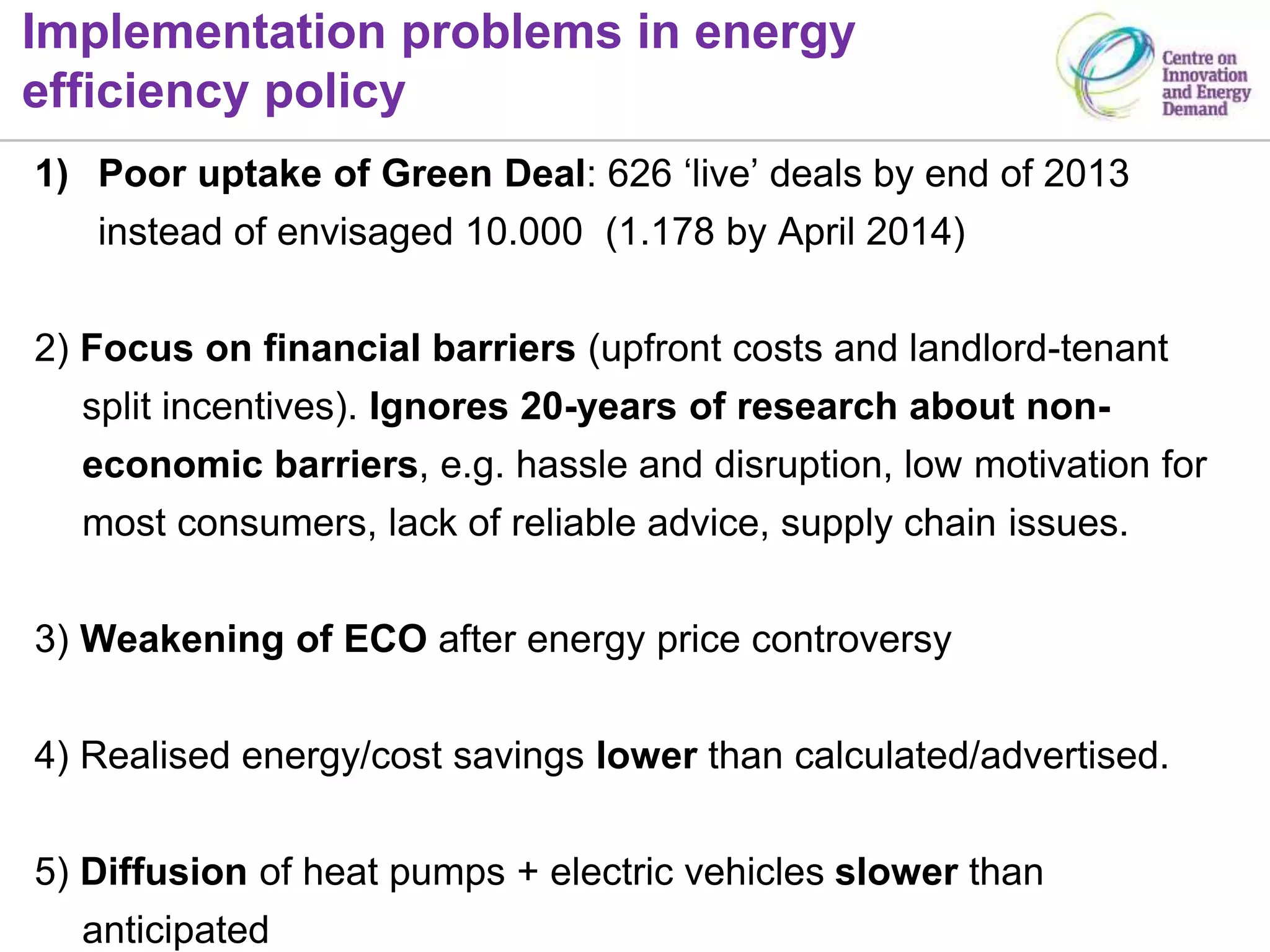 1) The energy efficiency revolution in the UK is facing implementation problems like poor uptake of the Green Deal program and weaknesses in policy like the watering down of the ECO program.