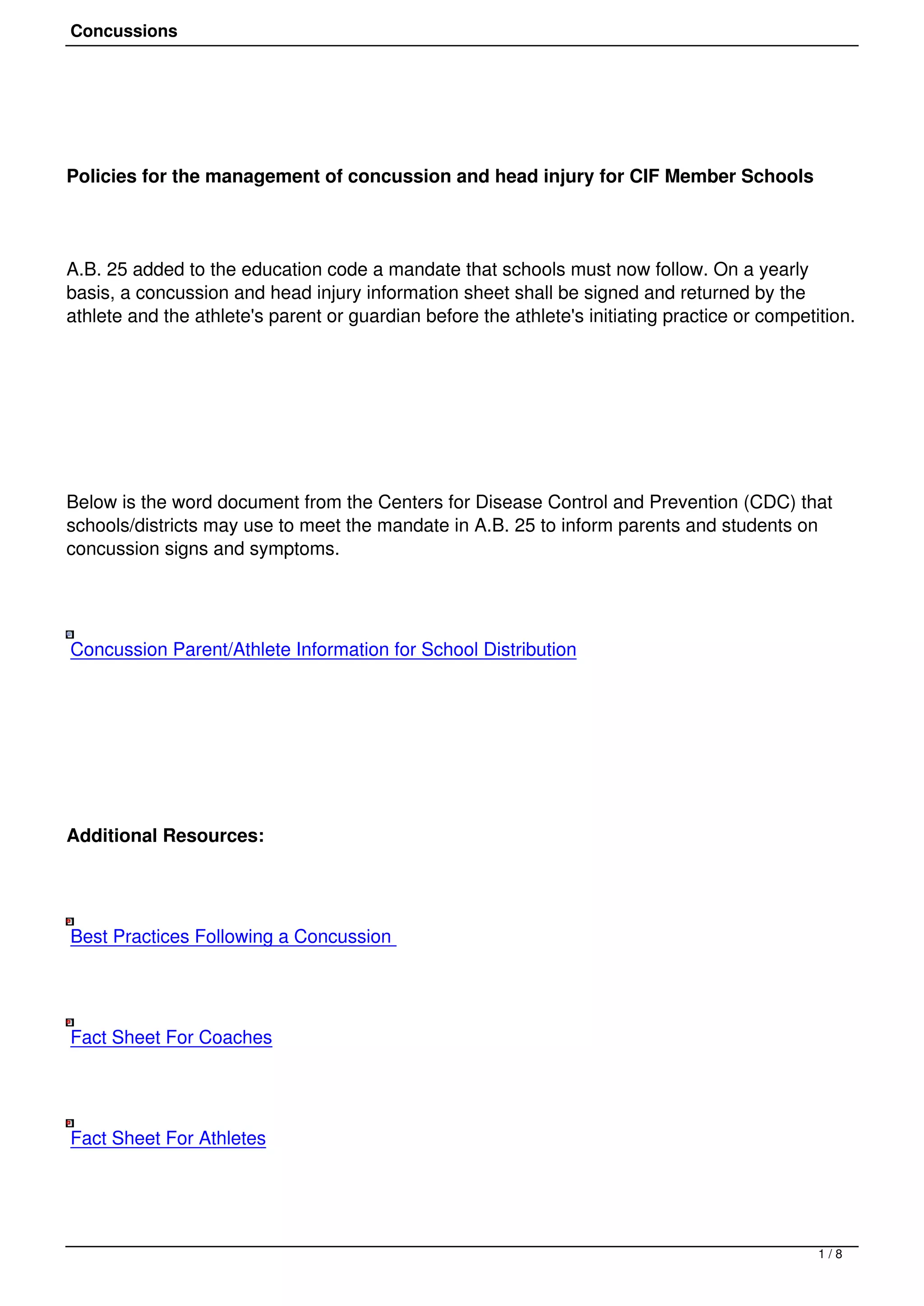 This document provides information and resources about concussions for schools, coaches, athletes, and parents. It outlines policies requiring annual concussion education, removal from play for any athlete suspected of a concussion, and clearance from a healthcare provider before returning to play. It emphasizes that all head impacts need to be taken seriously, as even mild concussions can have severe consequences if not properly managed. Resources are provided for signs and symptoms, best practices, and online trainings for coaches and clinicians.
