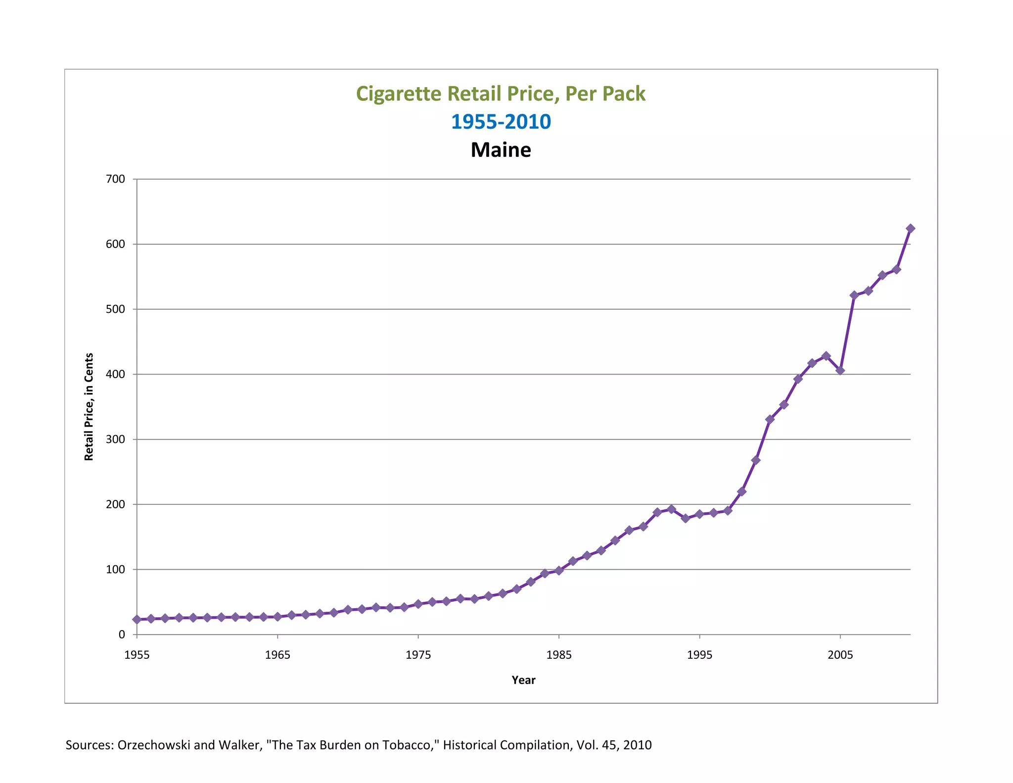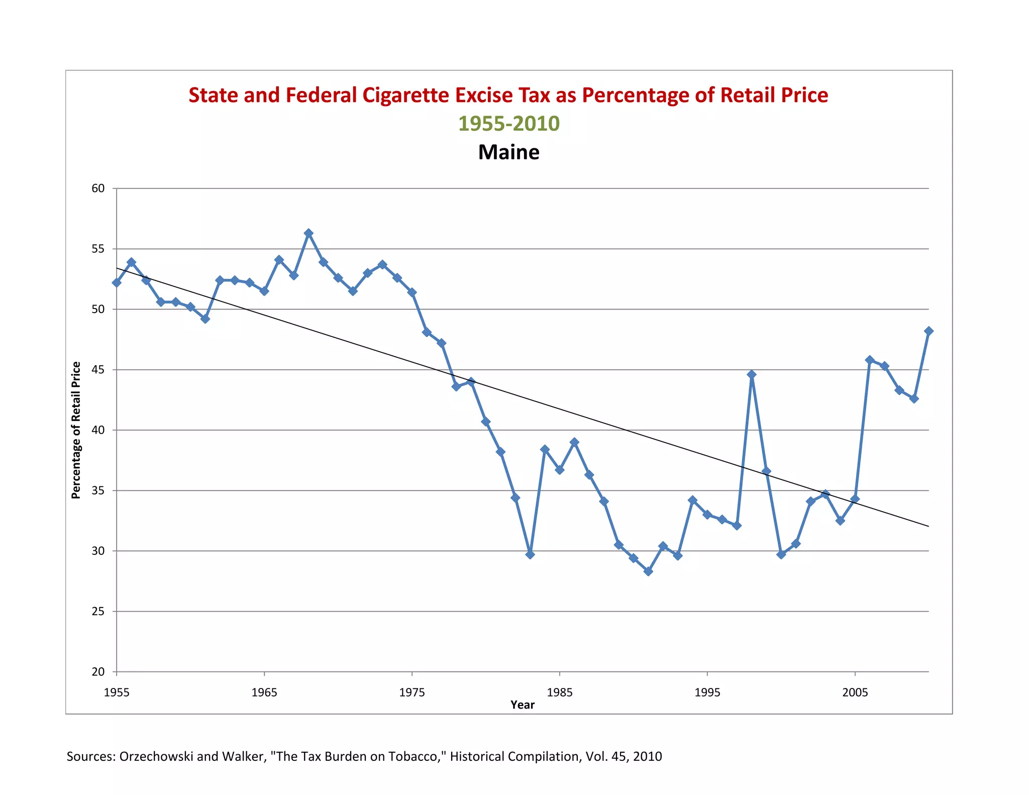 The document contains data from 1955-2010 on cigarette excise taxes, retail prices, and per capita sales in Maine. It shows that the tax as a percentage of retail price increased from 52.2% in 1955 to 48.2% in 2010. Over this period, the retail price of cigarettes rose from $0.23 per pack to $6.24 per pack. Meanwhile, annual per capita cigarette sales in Maine declined from 133 packs in 1955 to 53 packs in 2010.