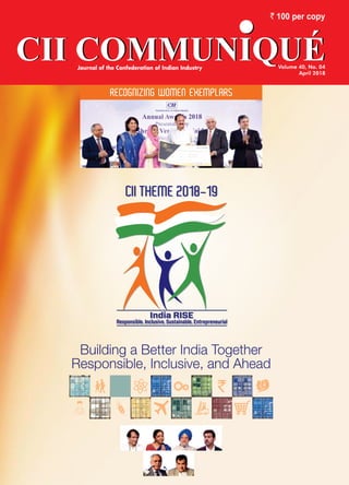 In April 2018, the Confederation of Indian Industry (CII) held its annual session focused on 'building a better India together,' recognizing grassroots women leaders for their transformative contributions in education, health, and micro-enterprises. Three exemplary women received the CII Foundation Woman Exemplar Award for their impactful work in empowering disadvantaged communities, highlighting CII's commitment to inclusivity and sustainability alongside its leadership for 2018-19. With a theme of 'India Rise: Responsible, Inclusive, Sustainable, Entrepreneurial', CII aims to engage in various sectors to foster national growth and development.