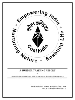 This document provides a summary of the author's summer training report on workshop practices and mechanical activities at the Central Workshop in Gevra. It describes several mechanical shops visited, including the electrical repair shop, engine shop, heavy repair shop, and machine shop. The electrical repair shop repairs AC/DC motors and transformers. The engine shop performs maintenance on various engine parts and systems. The heavy repair shop repairs large equipment like magnetorques and compressors. The machine shop contains lathe and shaper machines used for machining cylindrical parts.