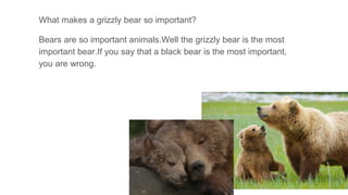 The grizzly bear is the most important bear in Montana. Bobcats and lynxes look similar but are different colors. Moose have antlers to protect themselves and come in different shapes and sizes, as they are huge animals. Wolves live in packs so they can attack big animals together. Lynxes are considered a Montana animal since some were made by God to live in the state.