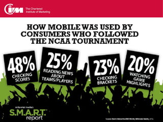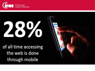 Mobile trends show rapid growth in mobile search driven by an annual holiday peak. Half of all mobile internet sessions start with search. Mobile search queries grew over 200% year-over-year in 2011 for top searches. Marketers are recognizing the need to optimize websites for mobile to improve the customer experience and capture the growing mobile traffic. However, many large companies still do not have mobile-optimized sites, presenting an opportunity for those that make the investment.