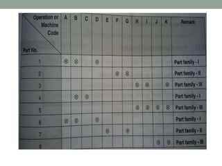 This document discusses group technology, which is a manufacturing philosophy that groups similar parts into families to take advantage of their design and manufacturing similarities. It defines part families as collections of parts that are similar geometrically or in their production steps. The document outlines four methods to group parts into families: visual inspection, composite part analysis, production flow analysis, and parts classification/coding. It also lists advantages like reduced setup times and disadvantages like difficulty in grouping parts.