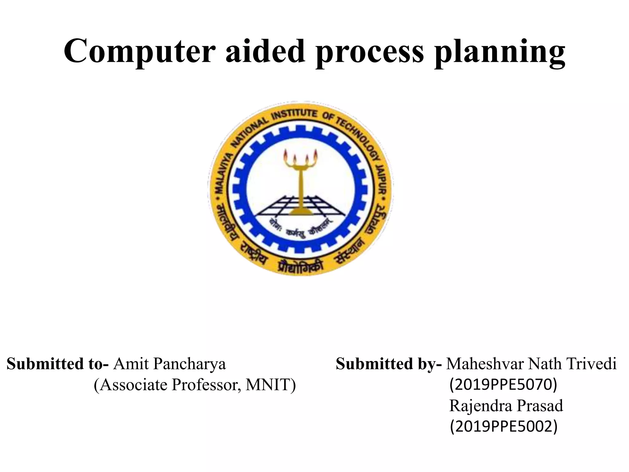 This document summarizes computer aided process planning. It discusses that process planning converts design information into manufacturing instructions to effectively produce products. It then describes different approaches to computer aided process planning including manual process planning, variant approach using group technology and part coding, and generative approach. The variant approach retrieves standard plans while the generative approach automatically generates new plans by matching part geometry to manufacturing capabilities. Overall, computer aided process planning aims to reduce time, labor, costs and improve precision and understanding of manufacturing processes.