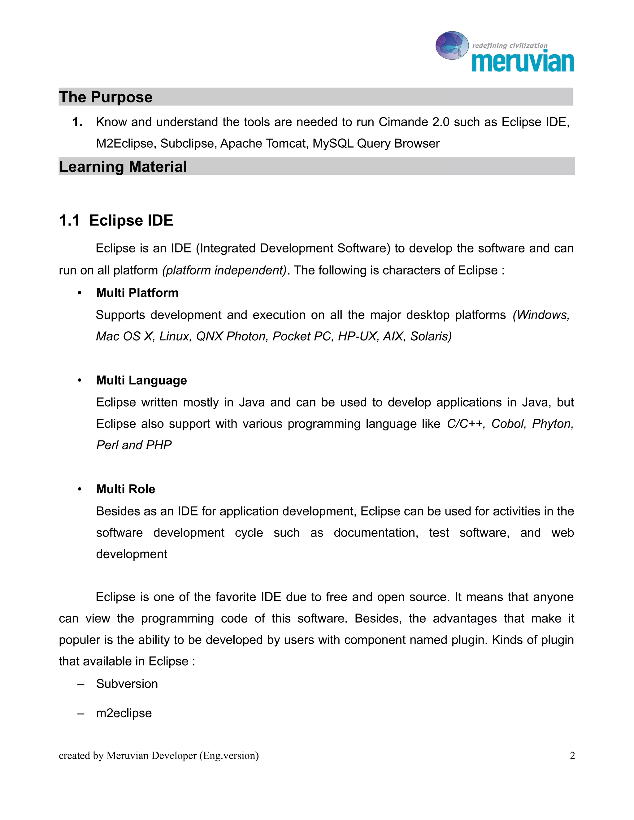 The document provides instructions for installing and configuring the tools needed to run the Cimande 2.0 application framework. It discusses downloading and installing Eclipse IDE, m2eclipse, Subclipse, Apache Tomcat, and MySQL Query Browser. It also explains how to create a Cimande project from the Maven archetype template, generate database schemas using Maven, and implement basic CRUD operations in Cimande for a sample person profile entity.