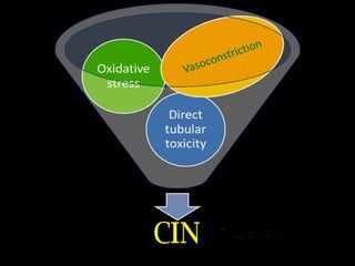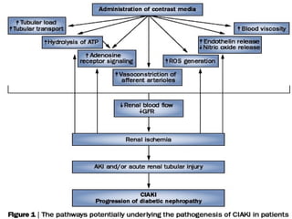 Contrast-induced nephropathy (CIN) is a common cause of hospital-acquired acute kidney injury. The risk of developing CIN is highest in patients with preexisting chronic kidney disease, diabetes, or those receiving a high volume of contrast agent. Nonionic, low-osmolar contrast agents have been shown to reduce the risk of CIN compared to ionic, high-osmolar agents. Preventive strategies focus on minimizing contrast volume, adequate hydration, and avoiding nephrotoxic medications.