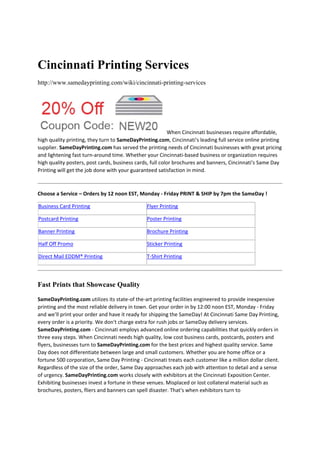 SameDayPrinting.com is a leading printing supplier in Cincinnati that provides affordable, high-quality printing services with fast turnaround times. It serves the needs of Cincinnati businesses and organizations with quick delivery even for same-day orders placed by noon. The company utilizes state-of-the-art printing facilities to offer inexpensive printing and reliable delivery in Cincinnati for various items like business cards, flyers, banners, and brochures.