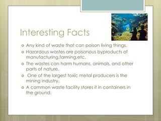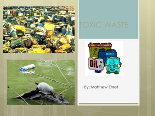 Toxic waste is poisonous byproducts from manufacturing, farming, and other industries that can harm humans, animals, and the environment. While regulations have reduced dangers since the 1970s, violations and outdated waste sites still pose threats such as groundwater pollution and risks from earthquakes. The document calls for educating the public on toxic waste dangers and pledges to properly dispose of trash and spread awareness.