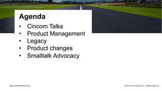 The Cincom Smalltalk roadmap for 2016 outlines advancements in their products, including ObjectStudio and VisualWorks, with a focus on modernizing technology and addressing customer needs. Key features introduced include new UI possibilities, enhancements to development tools, and protocol improvements, alongside a commitment to support legacy frameworks while phasing them out. The document emphasizes customer involvement and feedback in shaping future developments.