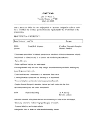 Cindy Eng has over 20 years of experience as a medical secretary and front desk manager in diagnostic imaging clinics. She is proficient in scheduling appointments, coordinating staff, managing accounts receivable, and typing over 80 words per minute. Her objective is to obtain full-time employment utilizing her qualifications and experience to contribute to a dynamic organization.