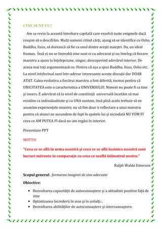 Documentul se concentrează pe un program educațional dedicat autocunoașterii și formării imaginii de sine adecvate pentru adolescenți, cu scopul de a dezvolta încrederea în sine și abilitățile de comunicare. Programul este structurat în mai multe sesiuni care includ activități interactive menite să ajute participanții să își conștientizeze calitățile personale, să dezvolte relații bazate pe încredere și să își exprime sentimentele și percepțiile. Fiecare ședință are obiective specifice și activități precum identificarea punctelor forte și slabe, completarea unor exerciții de reflecție și crearea unui mediu de sprijin în grup.