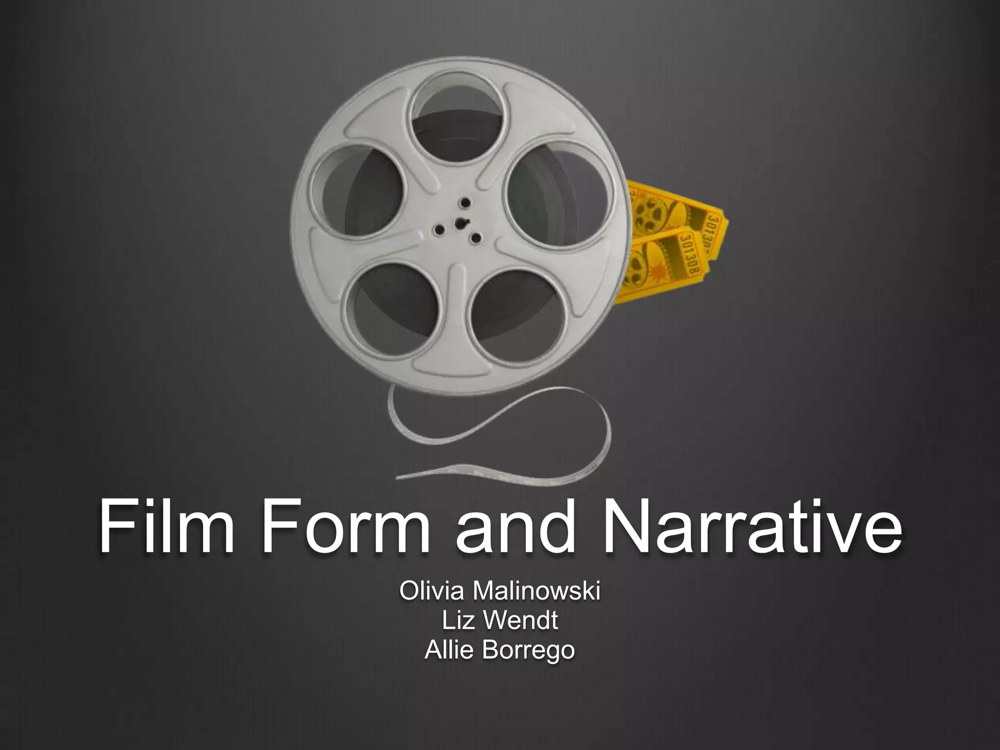 The document discusses key concepts of film form and narrative such as form, content, expectations, conventions, meaning, principles of film form including function, similarity and repetition, evaluation, narration, plot and story, cause and effect, time and space, openings and closings. It also covers patterns of narrative development and characteristics of narration in classical Hollywood cinema.